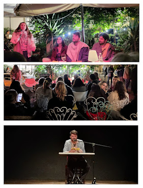 Ad esempio sarebbe qui da mettere un po' di foto della bellezza, e mi sa che lo faccio, o forse ne metto solo una collage fatta da Francesca Papp, che ancora ringrazio insieme ai ripescati dalla piena, in particolare Max Di Mario che ha pure con noi detto delle cose molto interessanti riguardanti il Diario Involontario, e metto allora questa foto fatta da tre foto, le prime due eravamo al Fua, Florence University of Arts, l'ultima ci sono io al tavolino del Circolo il Progresso, che è un posto incredibile, è una foto comoda riassuntiva e sono contento, quanto sono contento delle giornate fiorentine, che sono sempre preoccupato quando vado in giro, preoccupatissimo quando vado a Firenze, ma invece è stata gentile con me, Firenze, e ci ha fatto fare dei bei giri, anche Anish Kapoor, già che c'eravamo, siamo andati a vedere,